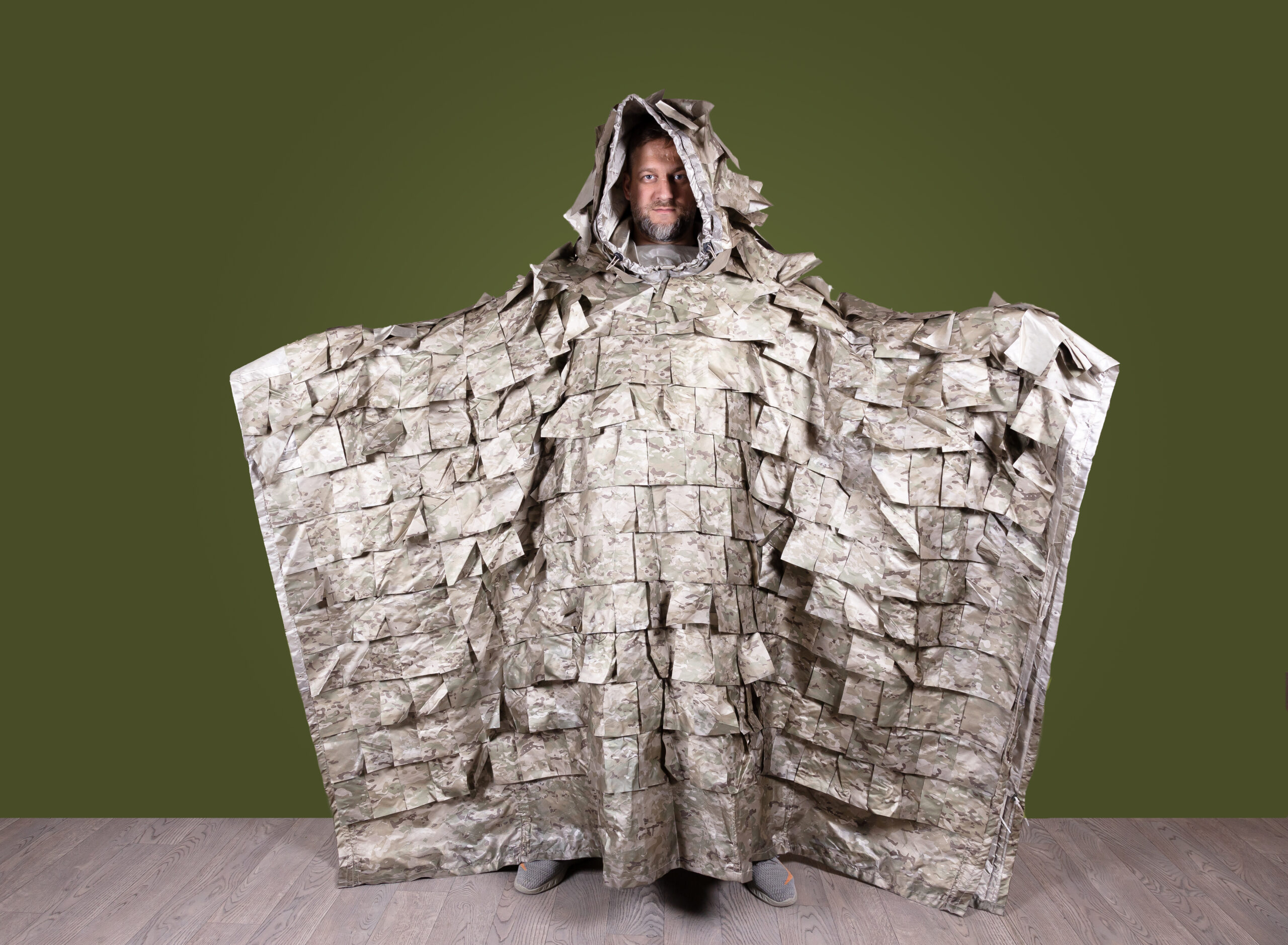 Пончо «Партизан» эффективно рассеивает тепло укрываемого объекта и отражает тепло внешней среды. Пончо имеет большой капюшон, закрывающий лицо, обеспечивая полную защиту головы и лица от тепловизионных средств разведки. В ряд преимуществ нашего пончо можно отнести также ненамокаемость, лёгкий вес и отсутствие шума. Прямо сейчас пончо «Партизан» помогает нашим бойцам на передовой СВО.