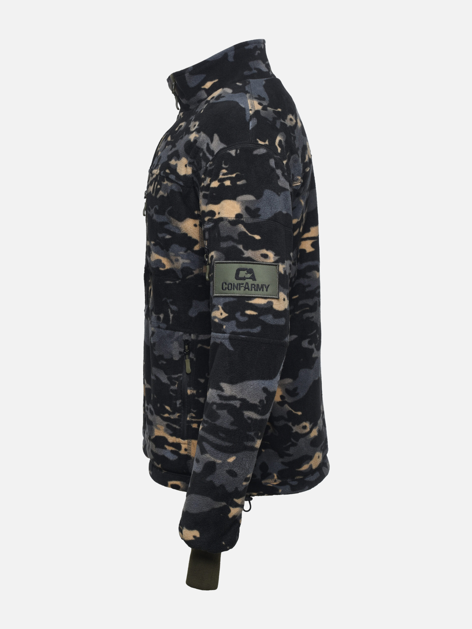 Мы предлагаем удобную мужскую двухстороннюю тактическую флисовую толстовку на молнии, которая обеспечивает тепло и комфорт в холодные дни. Она выполнена в 2 слоя из плотного флиса 270 г/м², который согреет вас в непогоду и в период холодов. Куртка имеет длинные рукава и высокий воротник-стойку прямой формы, который защищает шею от ветра. Модель представлена в цвете мультикам — с одной стороны и графит — с другой.