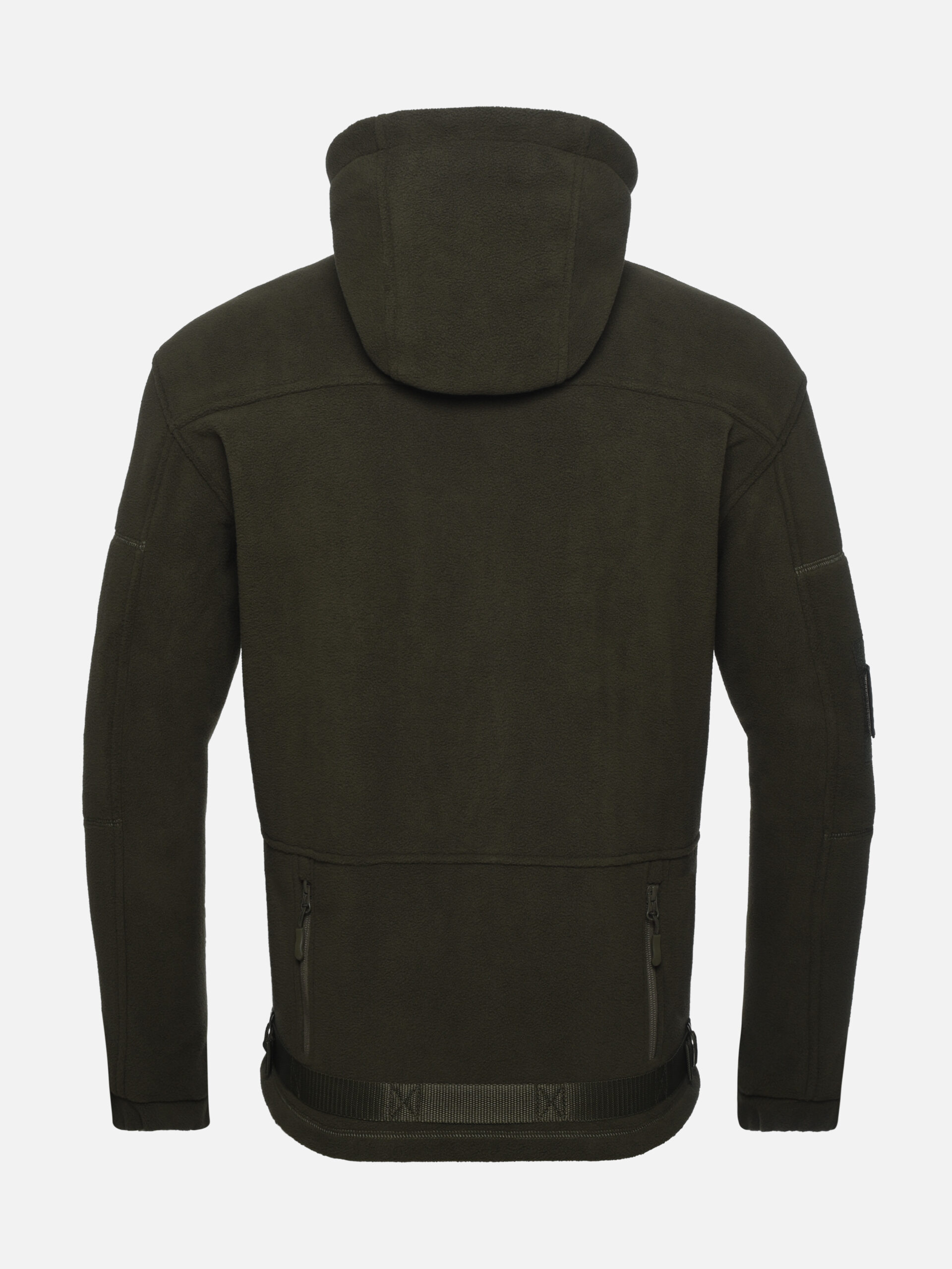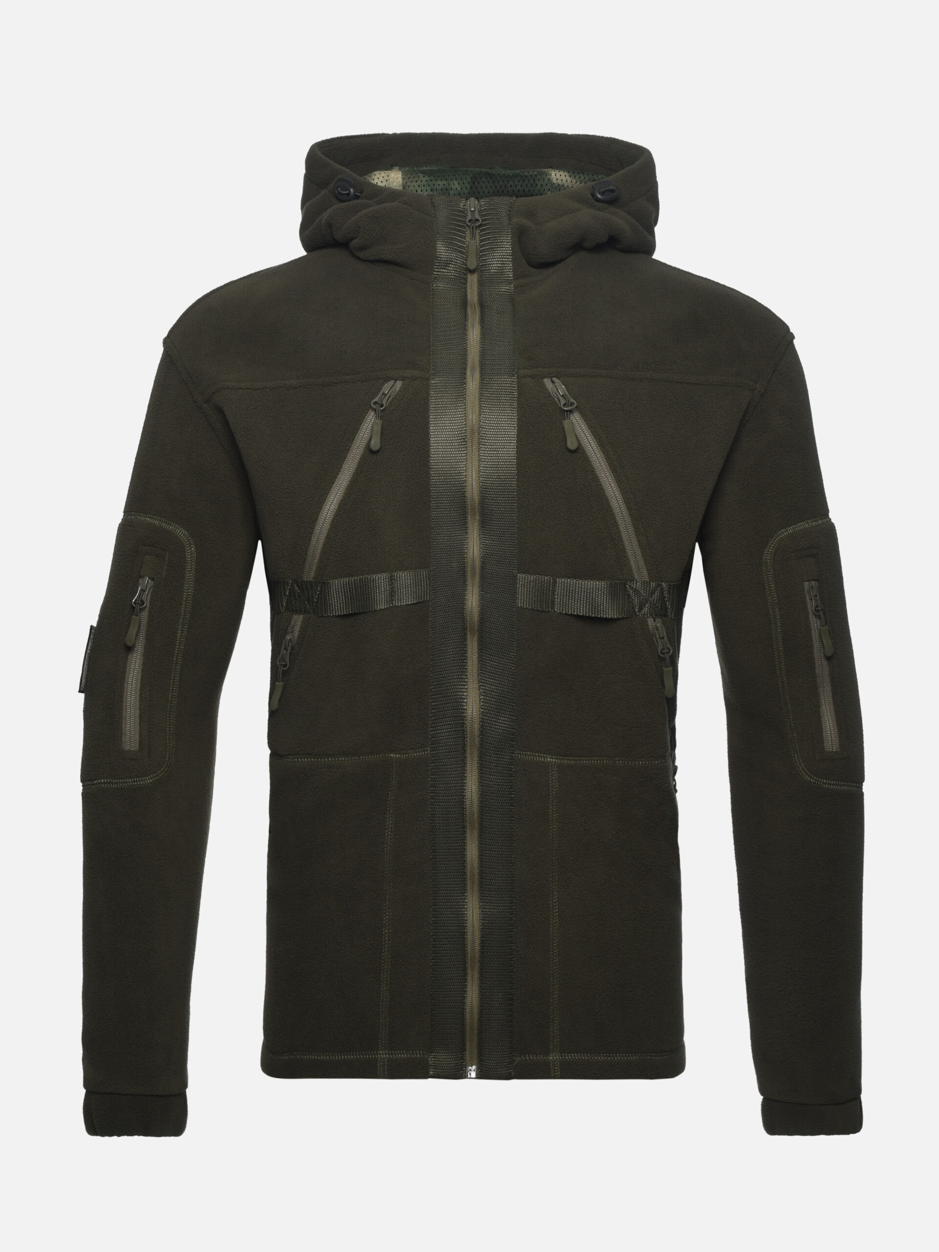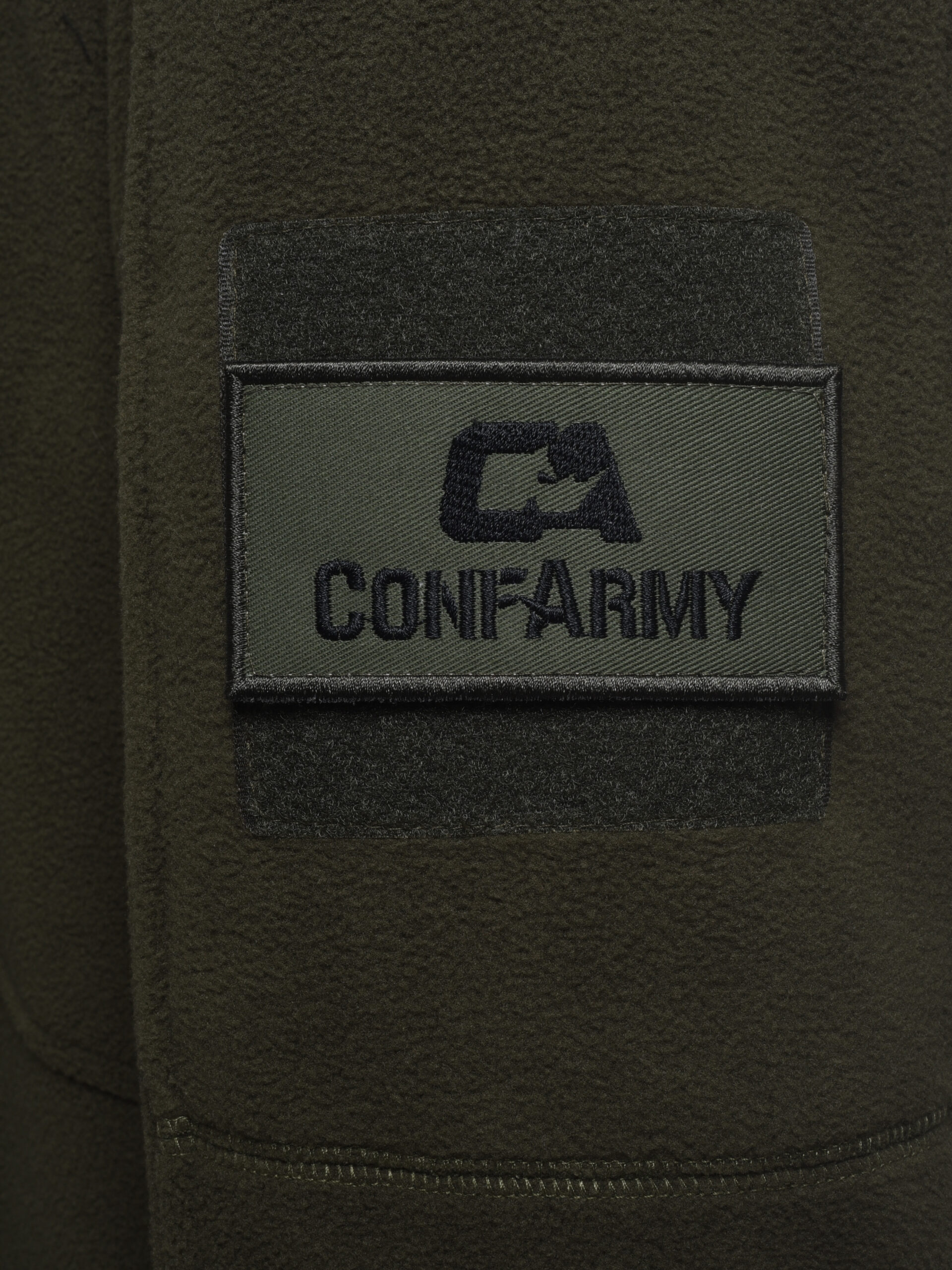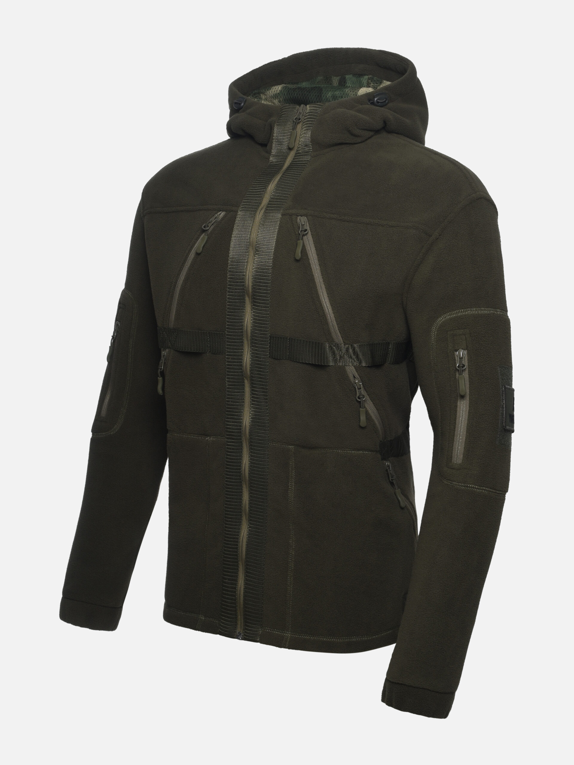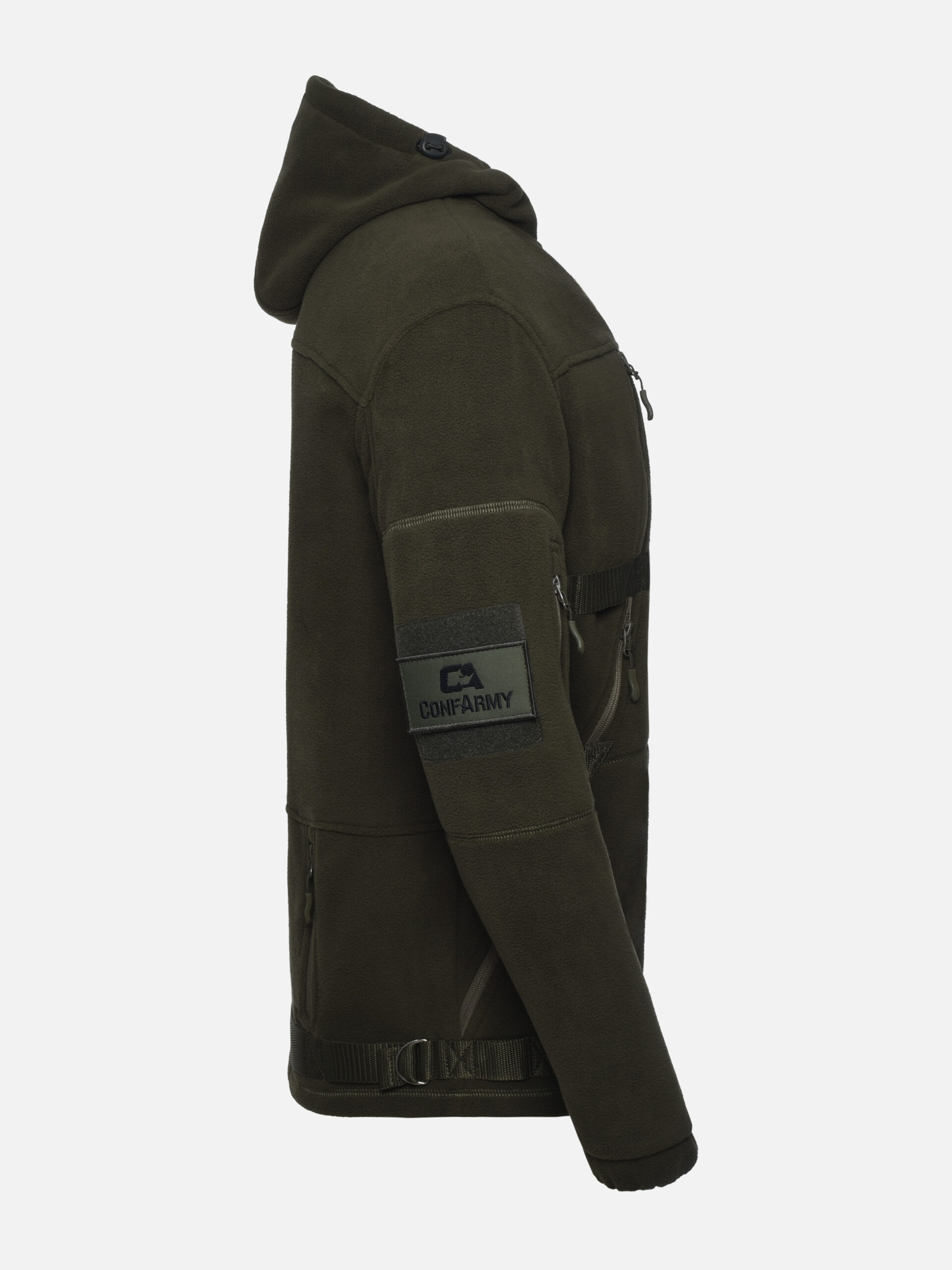 Флисовая мужская толстовка свободного покроя прямого силуэта с длинным рукавом и с капюшоном от бренда ConfАrmy — отличный выбор для прогулок на свежем воздухе, охоты, рыбалки и активного отдыха, а также для военного дела, т.к. оборудована системой Молле. Эта модель с капюшоном подходит как молодым, так и взрослым мужчинам, и оснащена множеством диагональных карманов на молнии. Со стороны спины в области поясницы модель оснащена «карманами для перчаток». Рукава толстовки также снабжены удобными карманами на молнии и велькро для фиксации съемных шевронов. Толстовка из премиального флиса плотностью 300 г/м² отличается прочностью и износостойкостью. Ее можно носить как самостоятельную куртку или как средний слой под верхнюю одежду. Практичная и удобная, она не стесняет движений и легко стирается, сохраняя форму и цвет даже при частой стирке. Эта универсальная толстовка подходит для любого времени года и доступна в широком размерном ряде, что позволяет выбрать идеальный размер для любого покупателя.